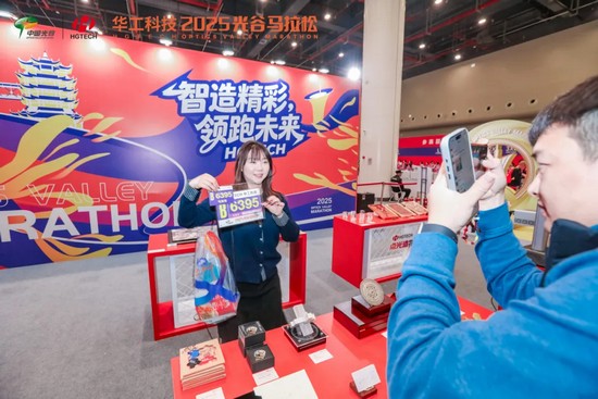 在半馬、全馬終點(diǎn)的華工科技展臺,吸引了眾多選手駐足參與,現(xiàn)場氛圍熱鬧非凡。跑友們可參與趣味互動打卡,還能定制個人專屬獎牌??醇す庠诮饘偕稀爱嫯嫛?,為你鐫刻獨(dú)一無二的馬拉松記憶,讓科技傳遞光的溫暖祝福。