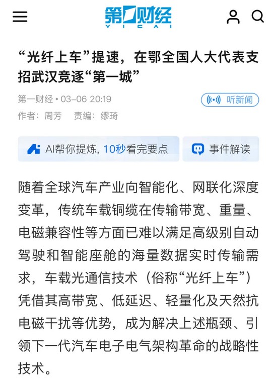 我們?cè)谛履茉?、船舶、航空航天等重點(diǎn)領(lǐng)域,與客戶的黏性在增強(qiáng)。新能源汽車是我們的重要應(yīng)用領(lǐng)域,(要)加快智能傳感器、6G通信,車載光互聯(lián)新產(chǎn)品的落地應(yīng)用。