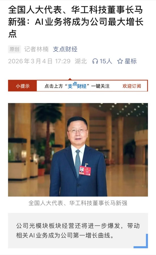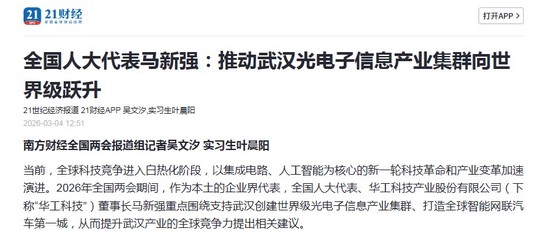 人民日?qǐng)?bào)《兩會(huì)特刊》、新華社《新華每日電訊》、證券時(shí)報(bào)、證券日?qǐng)?bào)、上海證券報(bào)、21世紀(jì)經(jīng)濟(jì)報(bào)道、每日經(jīng)濟(jì)新聞、經(jīng)濟(jì)觀察報(bào)、第一財(cái)經(jīng)、支點(diǎn)財(cái)經(jīng)、湖北日?qǐng)?bào)、長(zhǎng)江日?qǐng)?bào)等多家媒體關(guān)注馬新強(qiáng)代表的履職情況及華工科技創(chuàng)新發(fā)展。